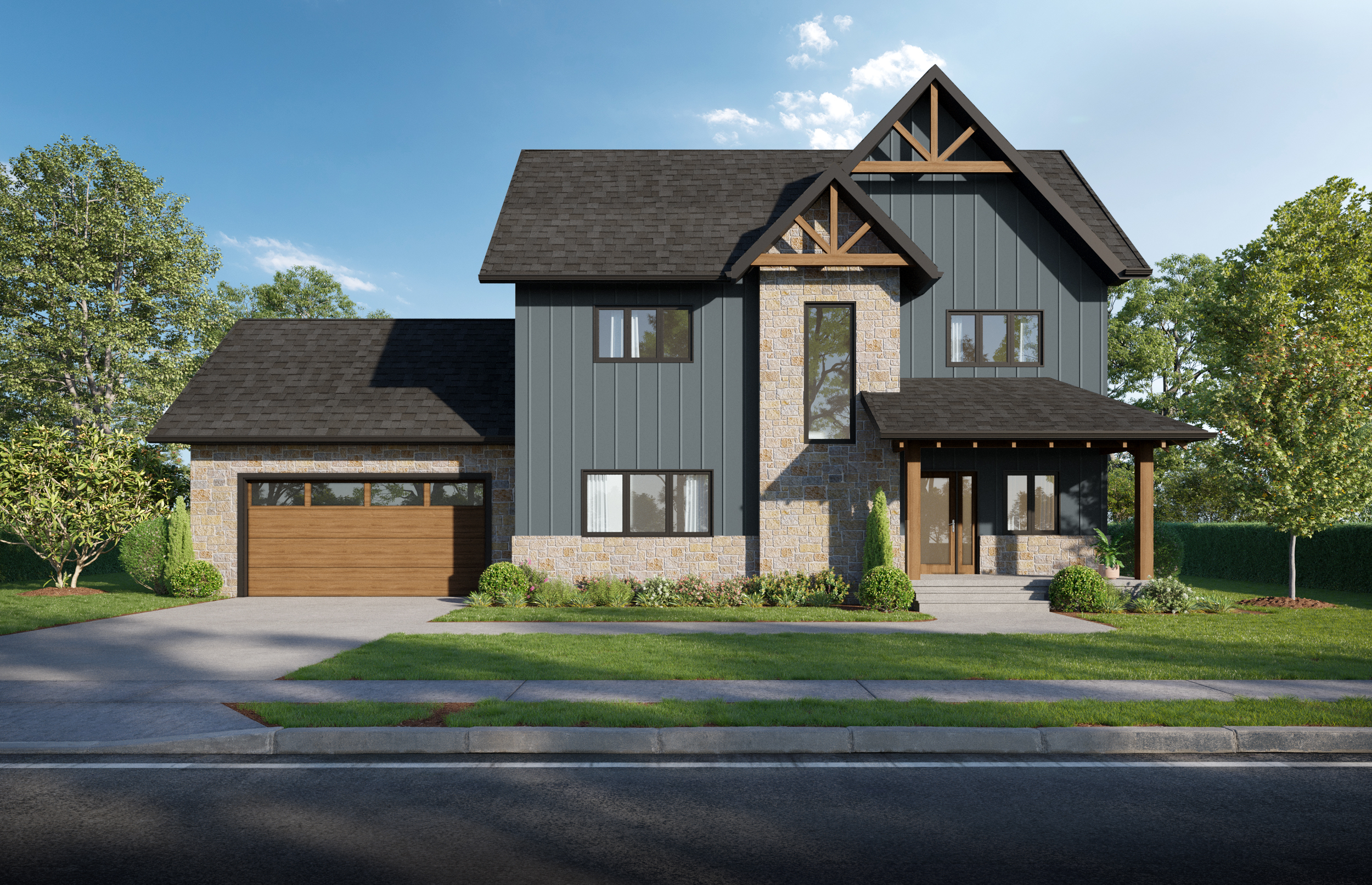 The Middlebranch is a 1,910 sq. ft. two-story home in Granite Village, blending rustic charm with modern comfort. Its wood timber accents, and premium composite siding complement the natural surroundings, while spacious interiors, cozy nooks, and large windows showcase Calabogie views, offering a perfect mix of nature and contemporary living.