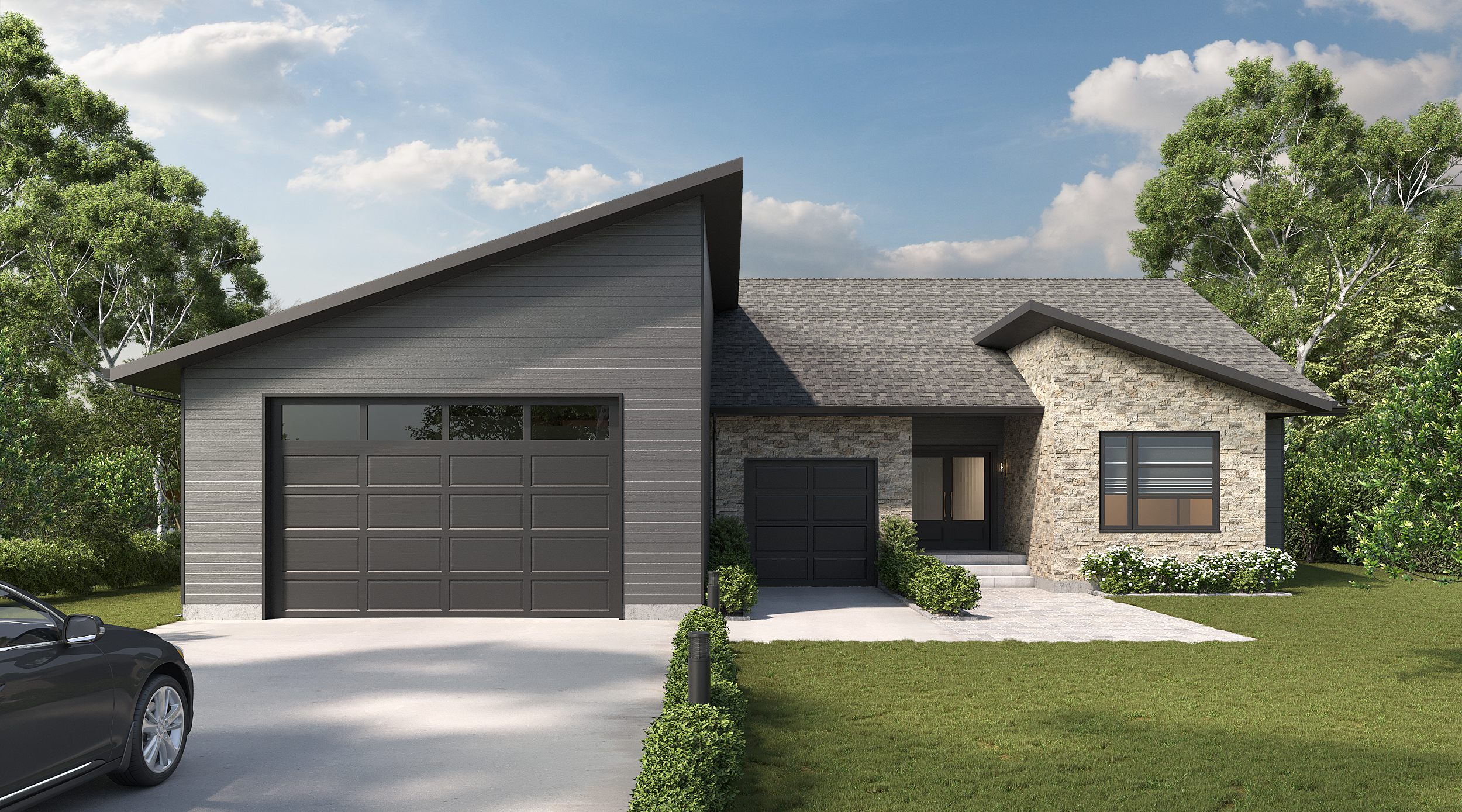 The Quinn, a 1,919 sq. ft. home in Granite Village, showcases modern design with a striking stone front and uniquely angled roofline. Its optional screened-in back porch offers a peaceful retreat, blending sleek style, comfort, and nature for a sophisticated yet serene living experience.