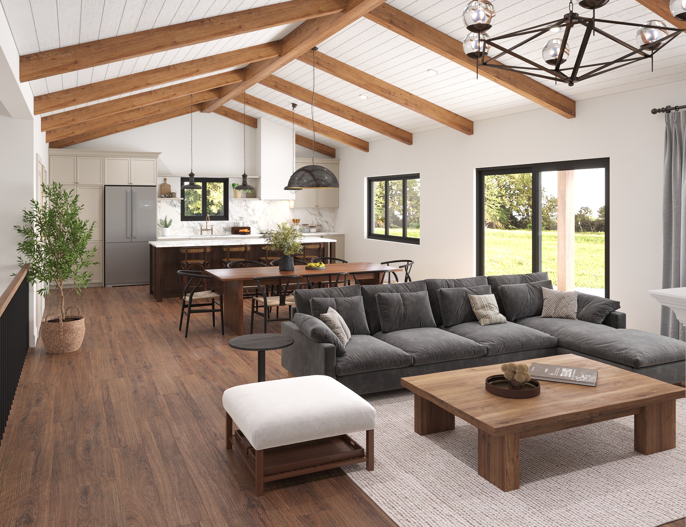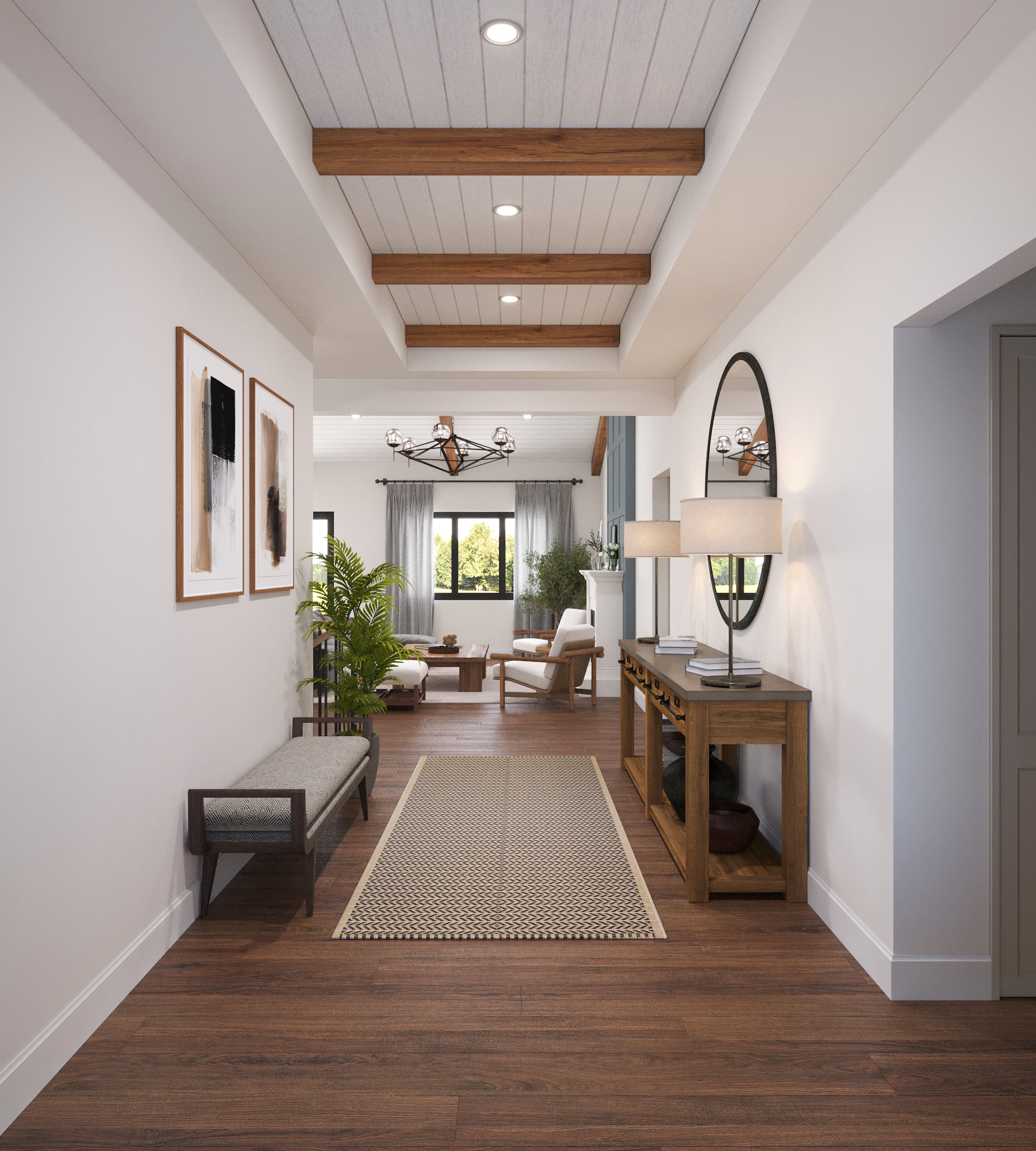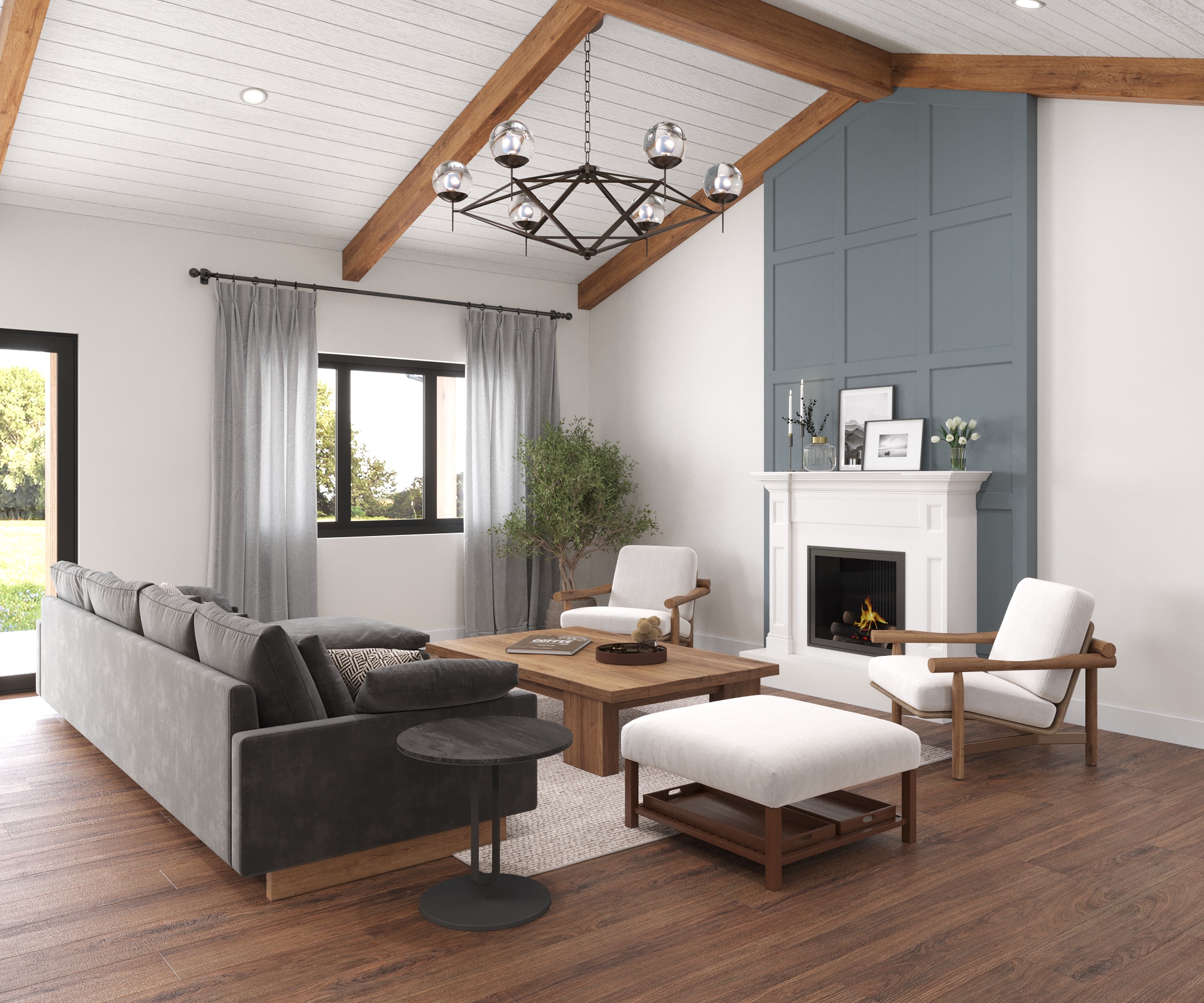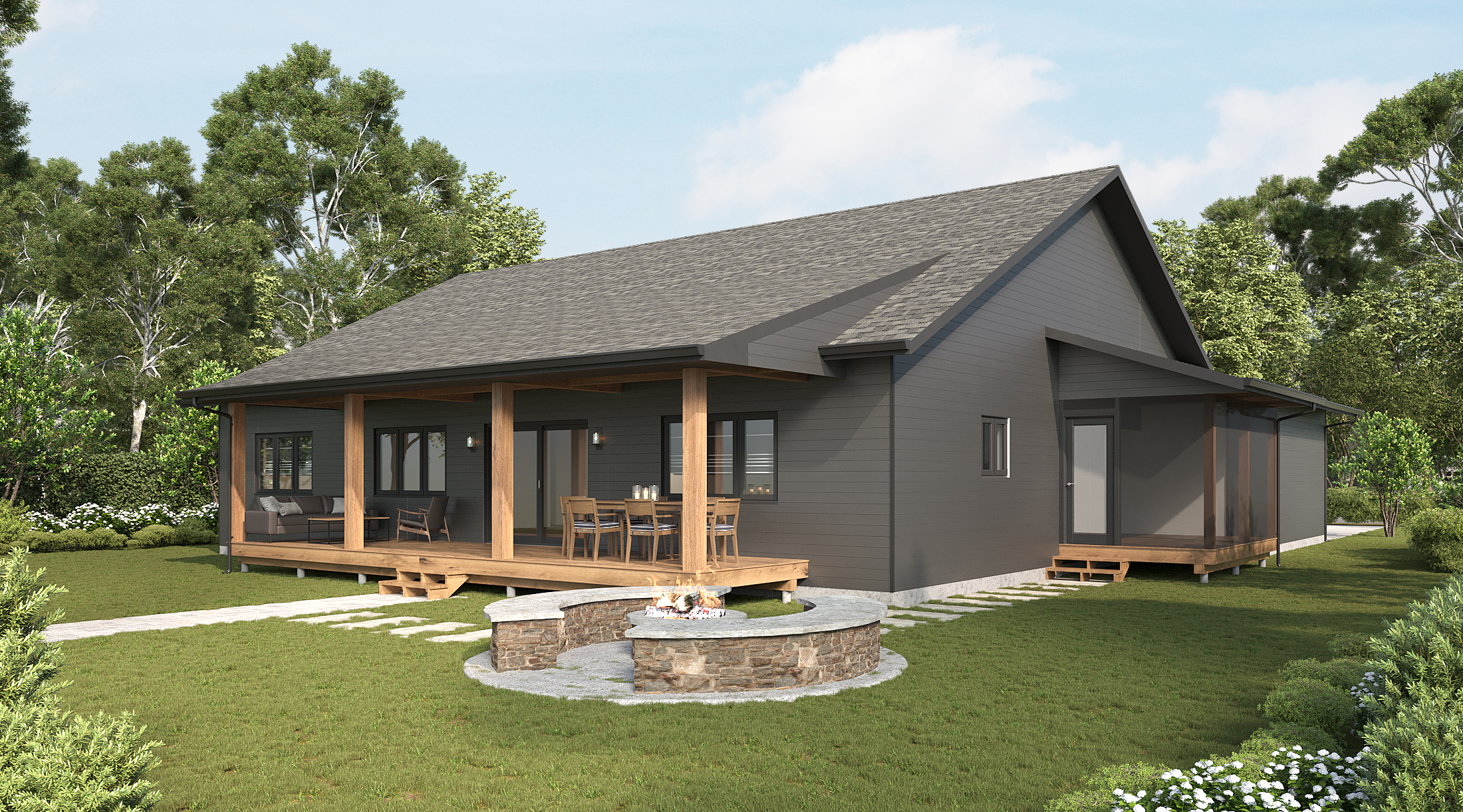 The Quinn, a 1,919 sq. ft. home in Granite Village, showcases modern design with a striking stone front and uniquely angled roofline. Its optional screened-in back porch offers a peaceful retreat, blending sleek style, comfort, and nature for a sophisticated yet serene living experience.