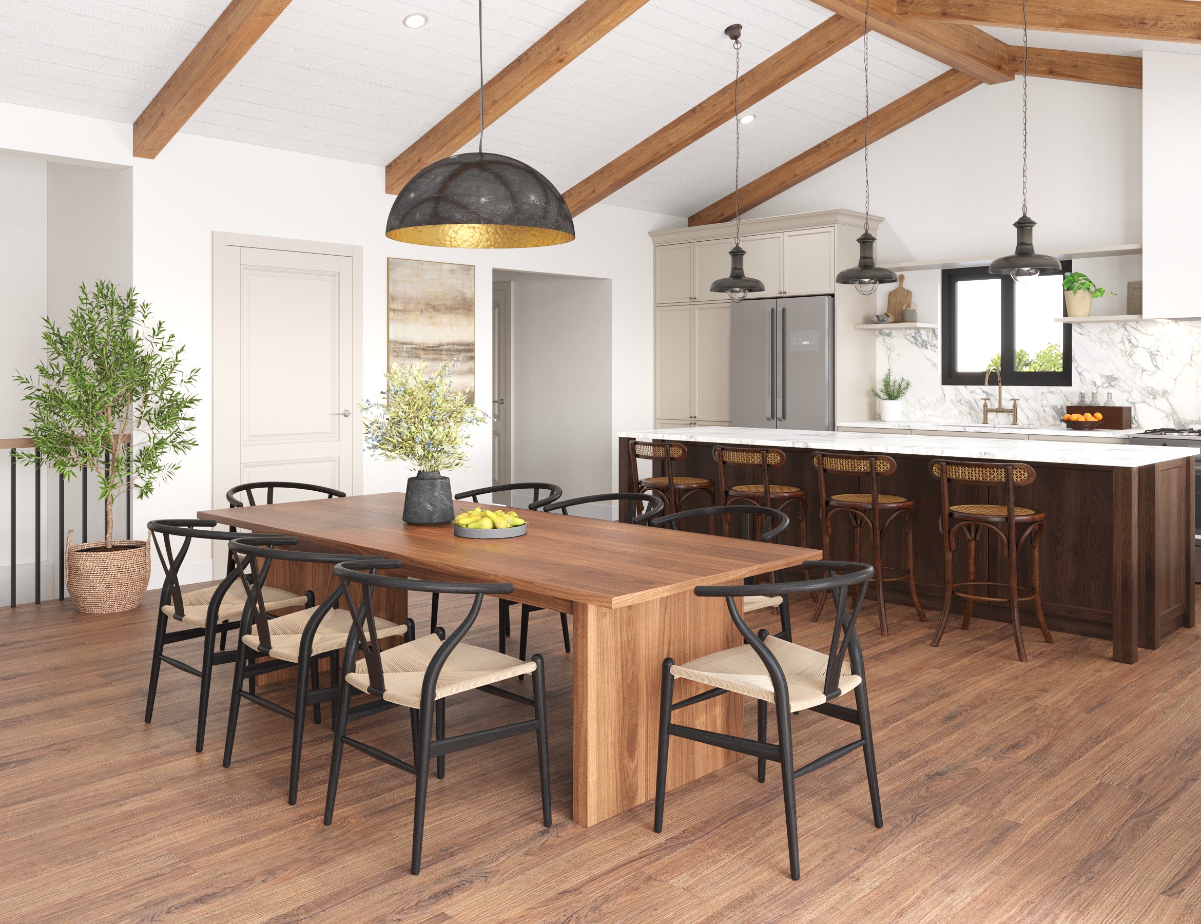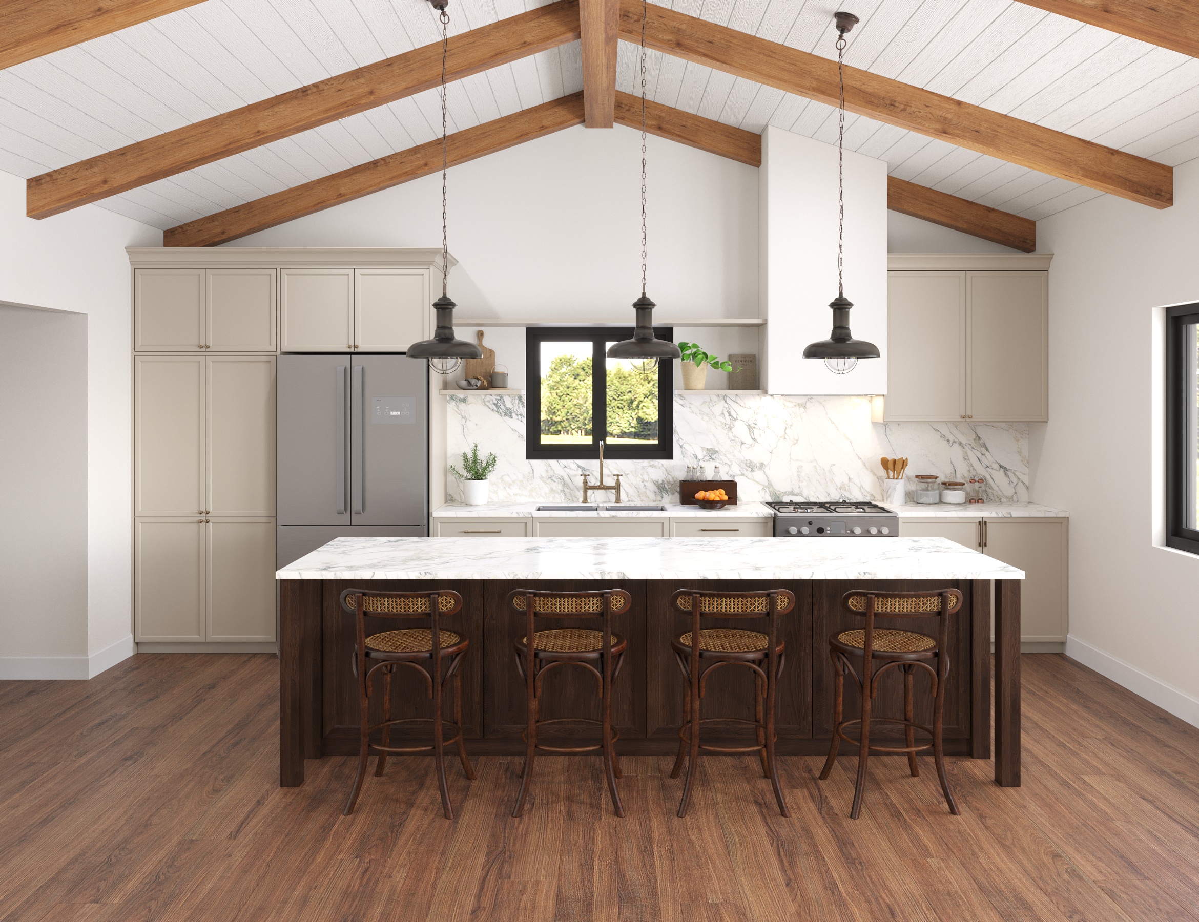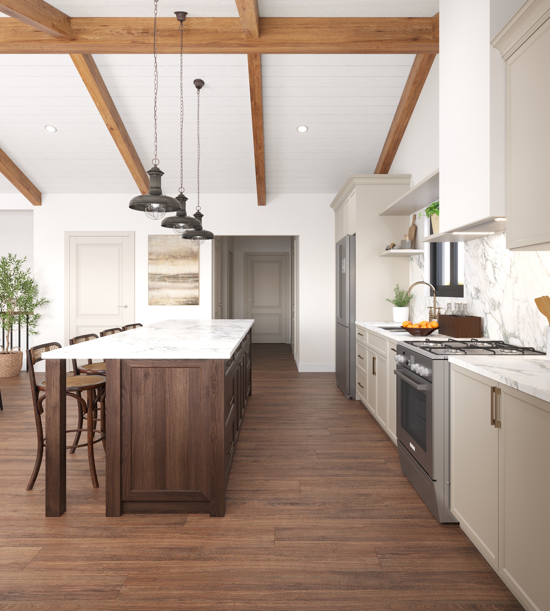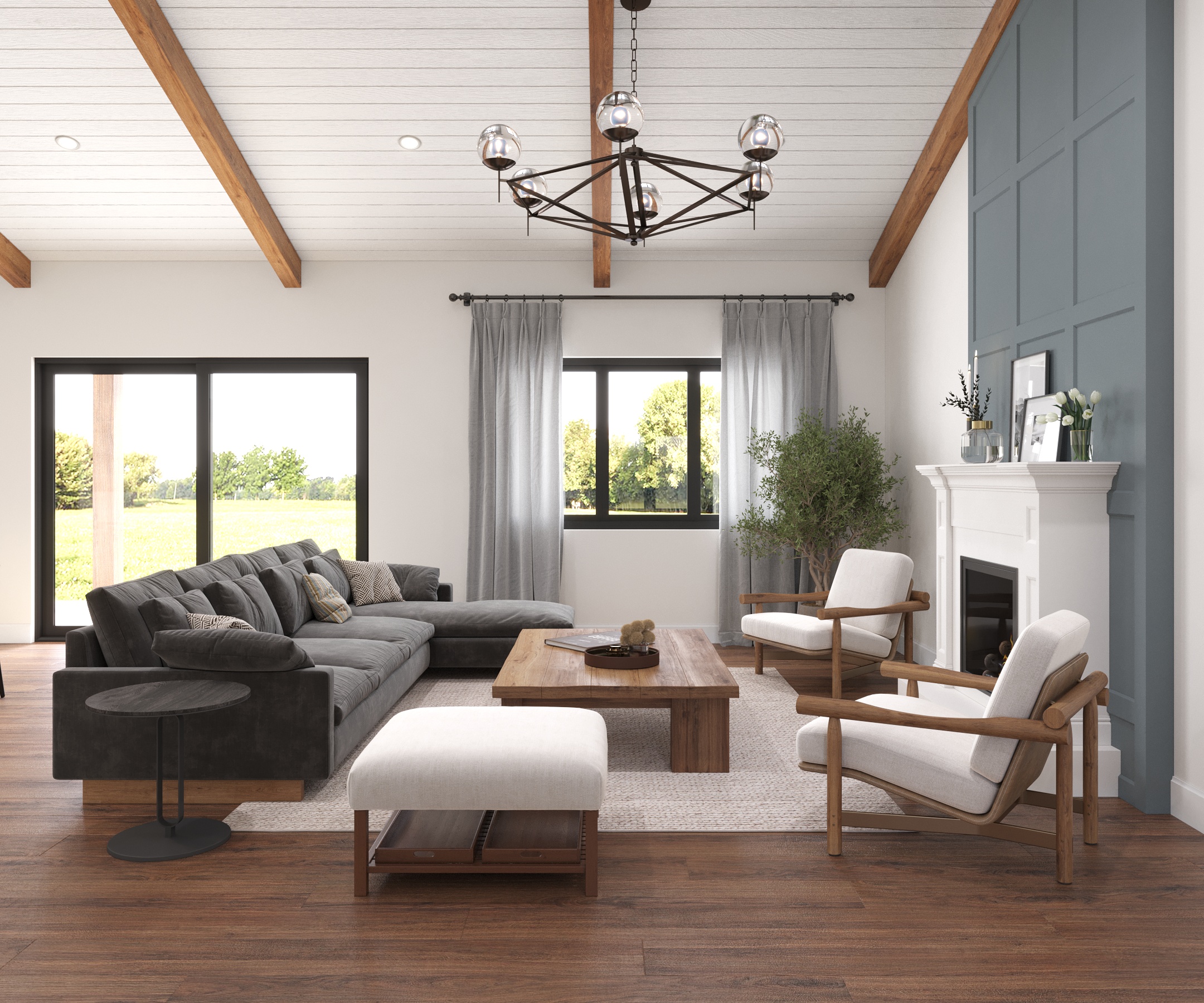 The Quinn, a 1,919 sq. ft. home in Granite Village, showcases modern design with a striking stone front and uniquely angled roofline. Its optional screened-in back porch offers a peaceful retreat, blending sleek style, comfort, and nature for a sophisticated yet serene living experience.